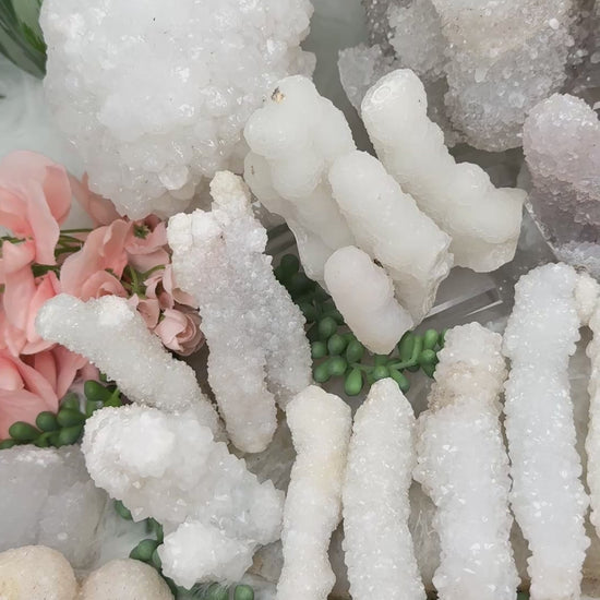 Very unique stalactite crystals from India. They are a few different kinds of crystals including, quartz, chalcedony (in the quartz family), and mordenite. A couple of the pieces even have some apophyllite on them. Some of these can stand tall on their own, and some can only lay flat. Take a look at the videos to see if they can or not.