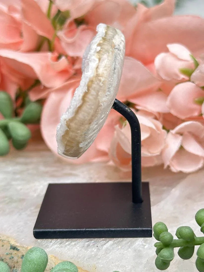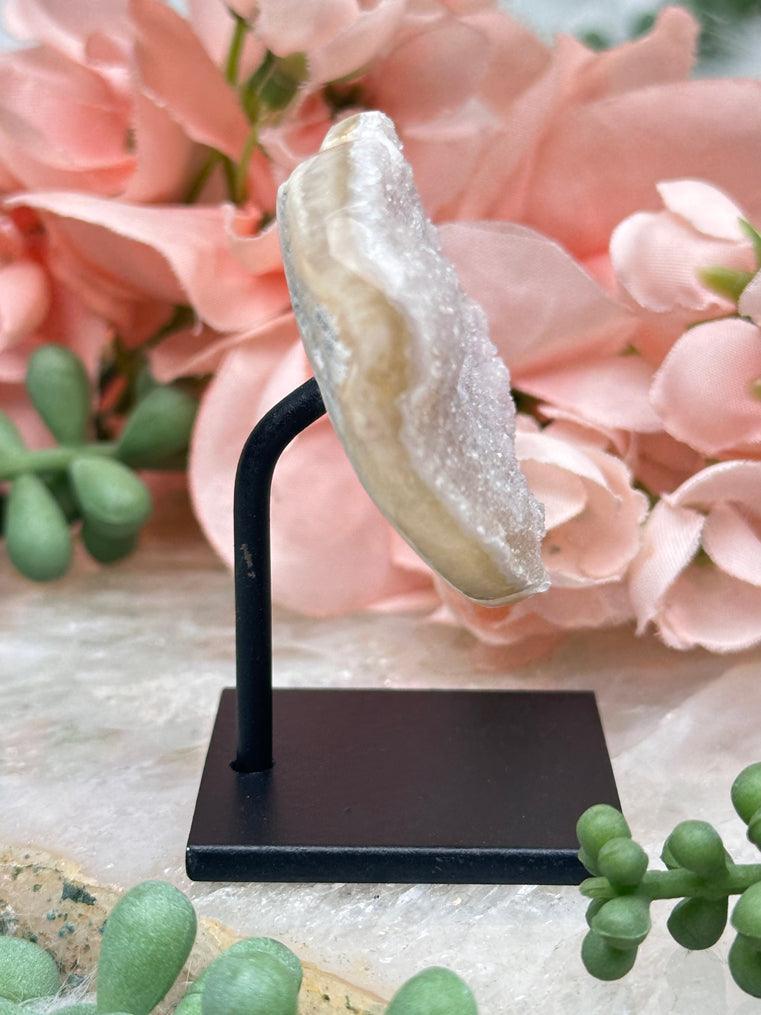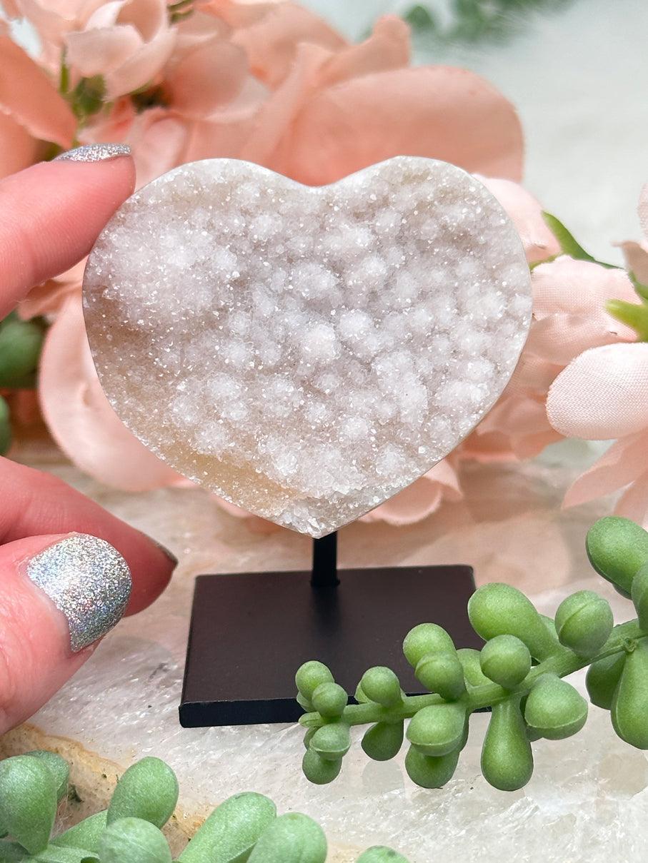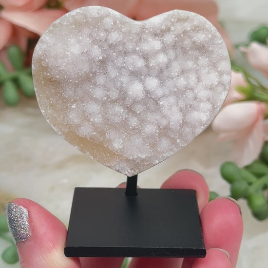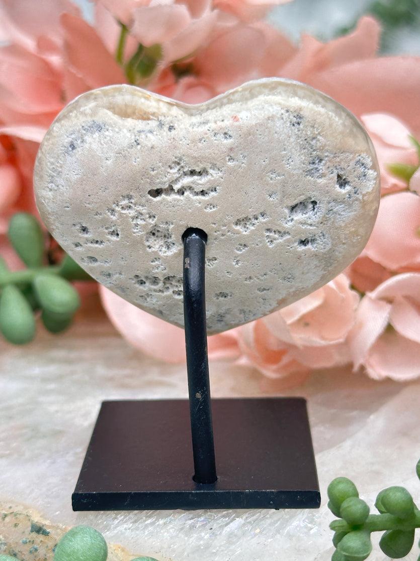 Adorable little rainbow amethyst crystal heart on a black stand. A mostly off-white coloring with some tan as well. The formation looks like little clouds almost covering the face. The back is semi-polished raw matrix stone.