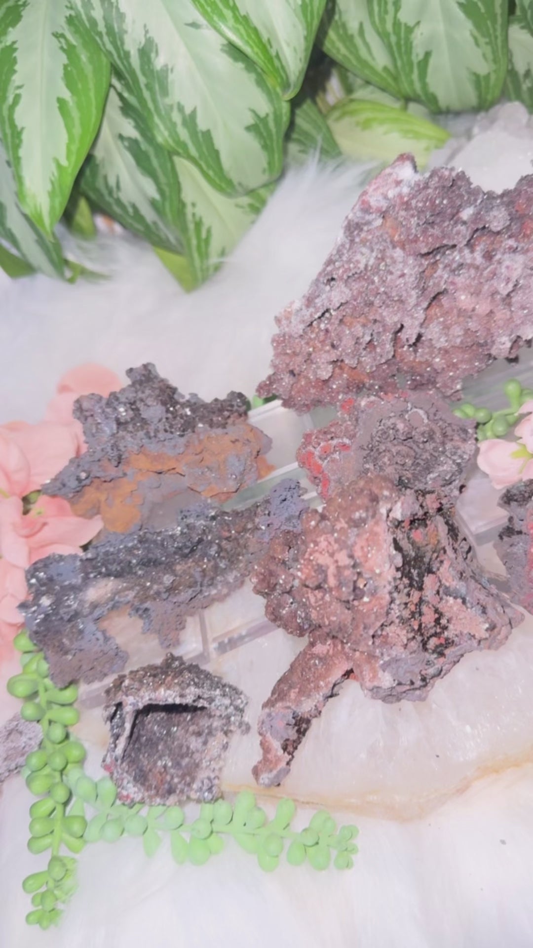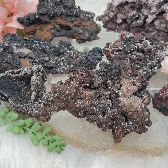 Beautiful and unique red and black calcite crystal clusters from Chihuahua, Mexico! These unique calcite clusters have a mix of overall reddish brown and black colors with a hint of white on some. The dark coloring is due to the hematite mineral inclusions. Some have black goethite too. These crystals have tons of beautiful sparkles if you take a look at the videos! The videos will also show each piece 360 and will show if they sit or not. There are THREE videos: 1. An 'overview' of all. 2. An 'overview' in the dark with flash. 3. The pieces shown individually in order of their rows left to right, back to front.