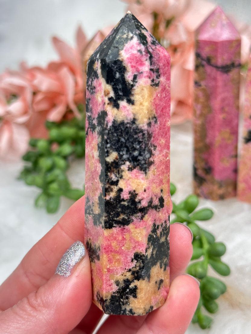 Adorable and unique colored Pink and Black Rhodonite obelisk points with tan and yellow from iron mixed in. Very unique markings that you don't see very often! These do have the coloring of the photos versus the video (the video shows them as more 'hot pink' than they really are). Beautiful mineral specimen for a special space in your home or standing next to your crystal shelf. A couple of these wobble but stand just fine (mostly the one all the way to the right).