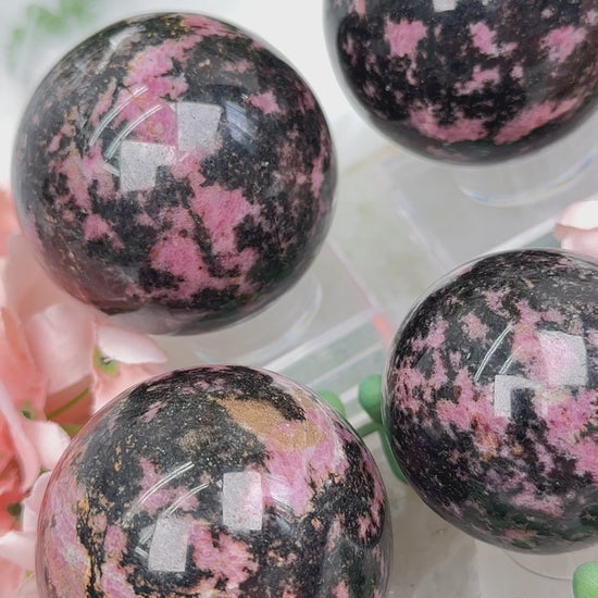 Adorable Black And Pink Rhodonite sphere crystals from Madagascar. These pieces have a contrasting back Manganese with some pink rhodonite mixed into them, and even some white veining as well in some. Choose your exact rhodonite sphere in the dropdown menu.