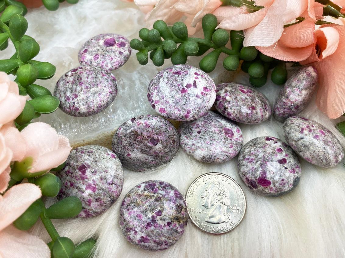These polished Ruby in Albite stones make for a perfect worry stone as they are a nice small pocket size. The red ruby pieces in these stones will glow under UV light. Be sure to checkout the photos and video. Â