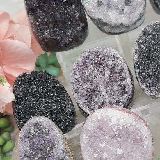 Adorable amethyst clusters from Brazil all with a round semi-polished cut. Most gray and black amethyst, but a few have a purple hue, and one even has a pink edge, another has a green banding. They are each unique in their own way with different shades of purple, gray and black! Be sure to check out the video of them.