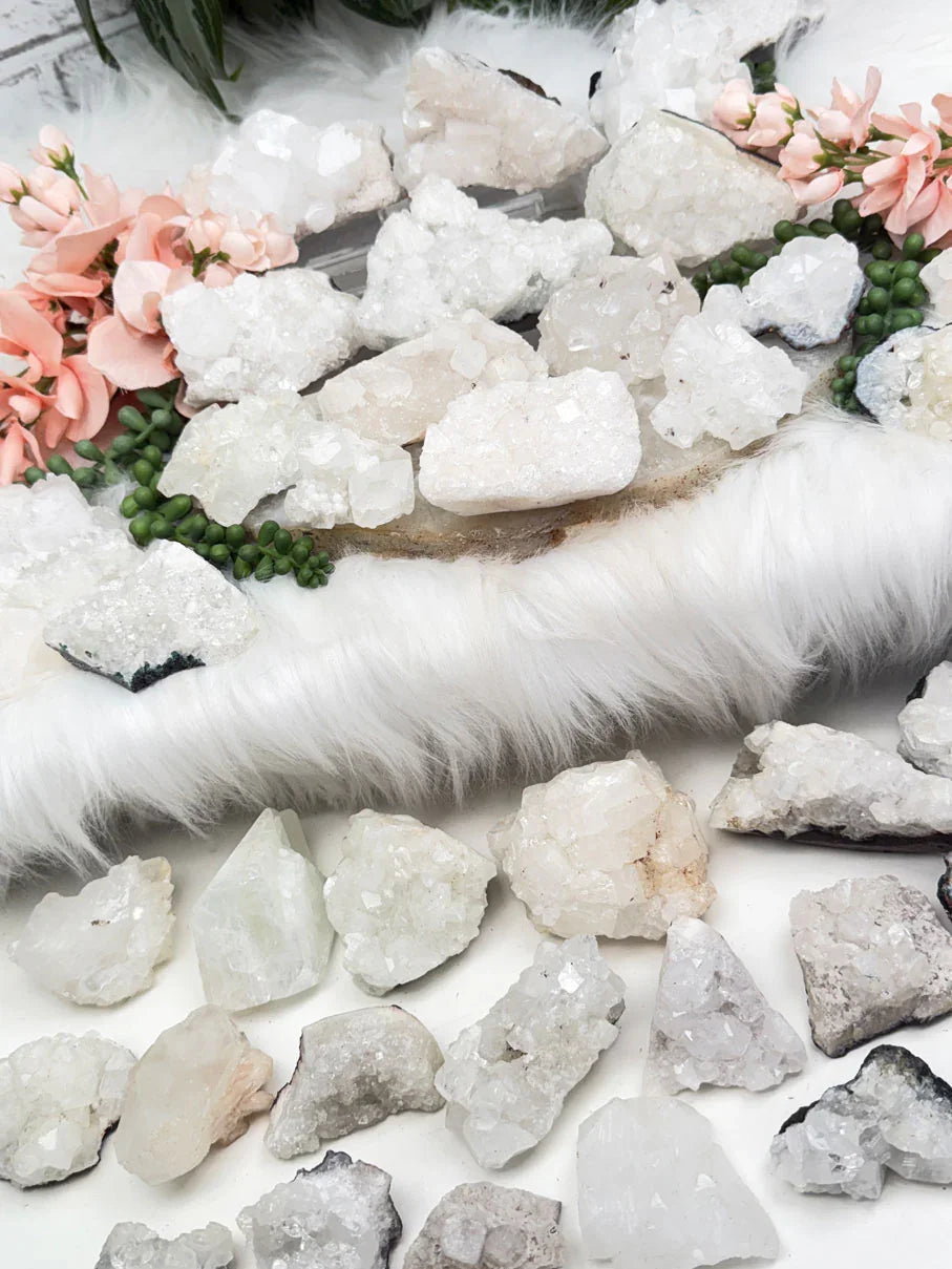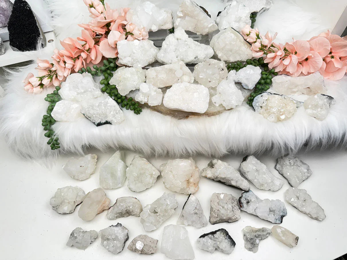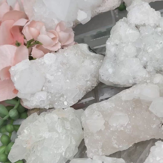 Cute little sparkly mostly white apophyllite crystal clusters from India. These pieces have different formation styles, you can see them best in the videos to get a full 360 of each piece. Most pieces only lay flat, but some sit nicely on their side to show off their face of crystals. A couple have chalcedony, some are growing over quartz, and a couple have peach stilbite.