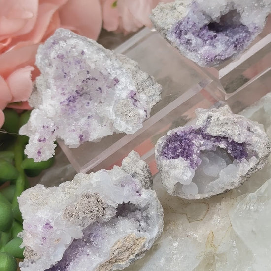 A beautiful new crystal find of 2021! Â These Blue Chalcedony and Purple Fluorite geode crystals have been named Spirit Flower Geodes. Â They come to us from San Benito, Chihuahua, Mexico. Â The purple and white Spirit Flower Geode has an adorable druzy chalcedony mixed with a more vibrant purple fluorite to give a soft and calming appearance. Â It is no wonder these are associated with the heart chakra and said to have calming energies... because I can totally see them as a stress reliever just getting lost in the sparkles of the druzy!