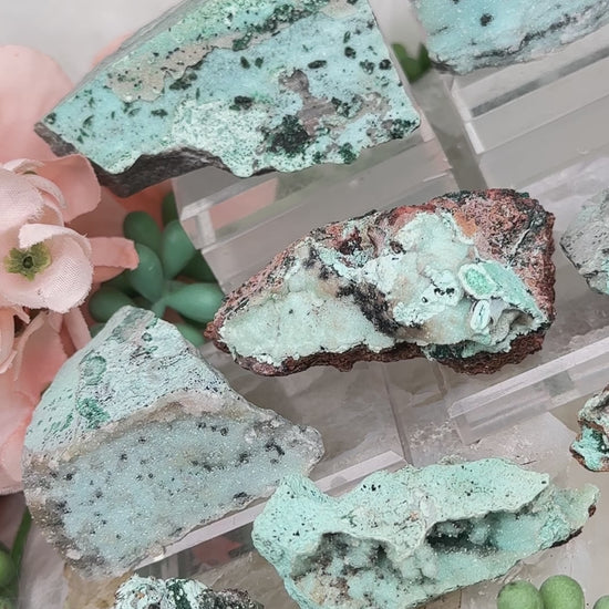 Beautiful aqua blue druzy Chrysocolla many with green Malachite from DR Congo with amazing sparkle (check out the video). These druzy chrysocolla crystals have a sparkly light blue coloring with a little bit of the green malachite (some pieces more than others). Even a lot of the back sides of these pieces are cool to look at! Some has have some brown hues from the matrix material. Love these!