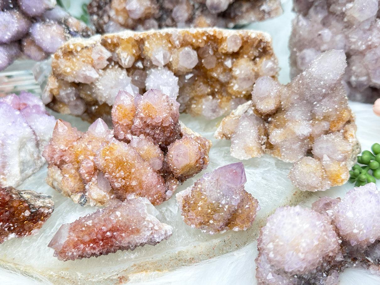 Super cute and colorful spirit quartz clusters in an array of point formations from chunky to fairy quartz. Yellow, purple, red, black and more options. Very unique! Some of these are a classic purple spirit quartz coloring, while some have an overall yellow or orange look. Some are light purple while some are more vibrant. The yellow, red, black and orange coloring comes from iron and hematite inclusions. Lots of different looks to choose from!