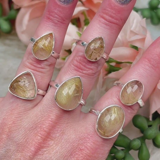 Cute and fun gold rutilated quartz sterling silver rings. These each have a mix of clear quartz and yellow rutile rods. Each one is unique in their shape, size, and rutile pattern. They all have a simple silver band. Take a look at the video to see them in better detail.