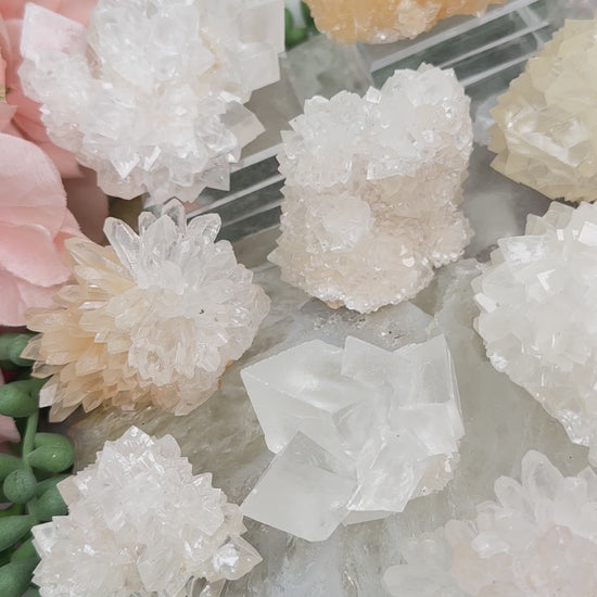 Unique and uncommon find of calcite from Indonesia that is very UV reactive. These are mostly white to off white in color with a couple more having a bit of yellow or orange hues. Some are more 'spike' like points, while some are more of a cubic formation. Some are very sparkly and some are more matte. All very cool in their own ways.