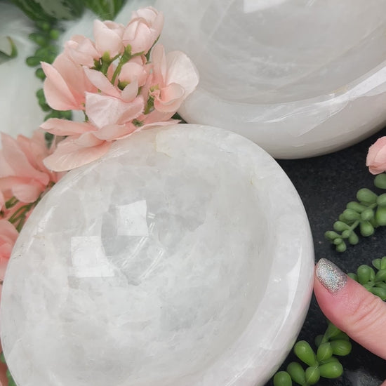 Simple and classic white quartz bowls from Madagascar. These both have a nice big chunky round look overall. There are some spots with iron and other darker spots and veins. These quartz bowls are a great addition to any space and perfect for holding jewelry and small crystal tumbles. You could even use by your door to hold keys or small trinkets.