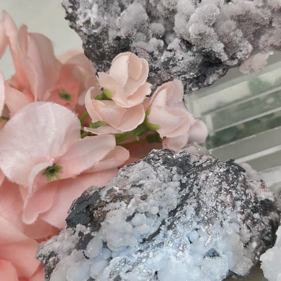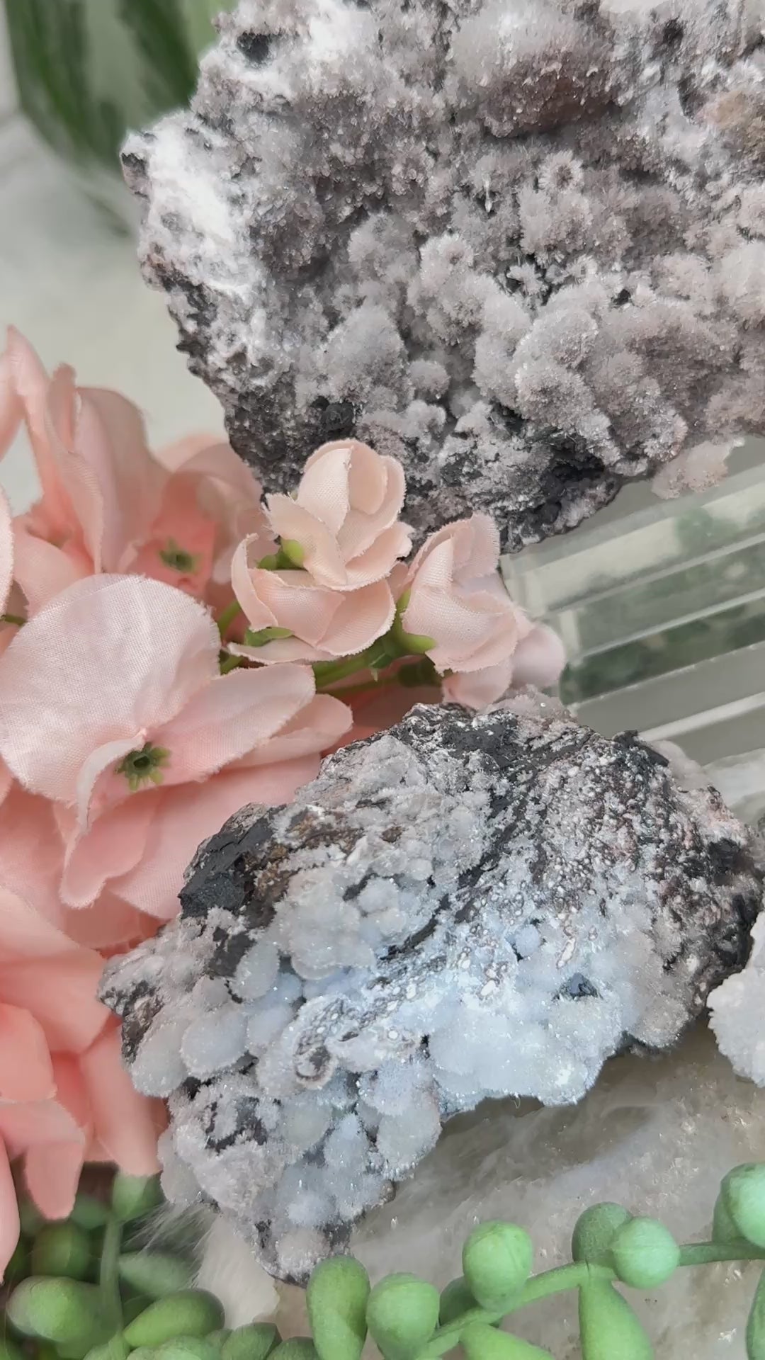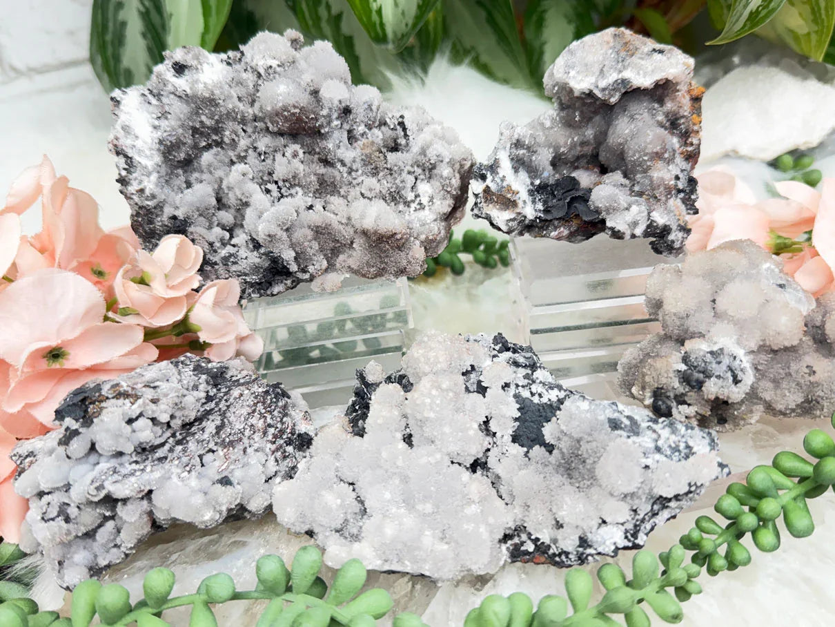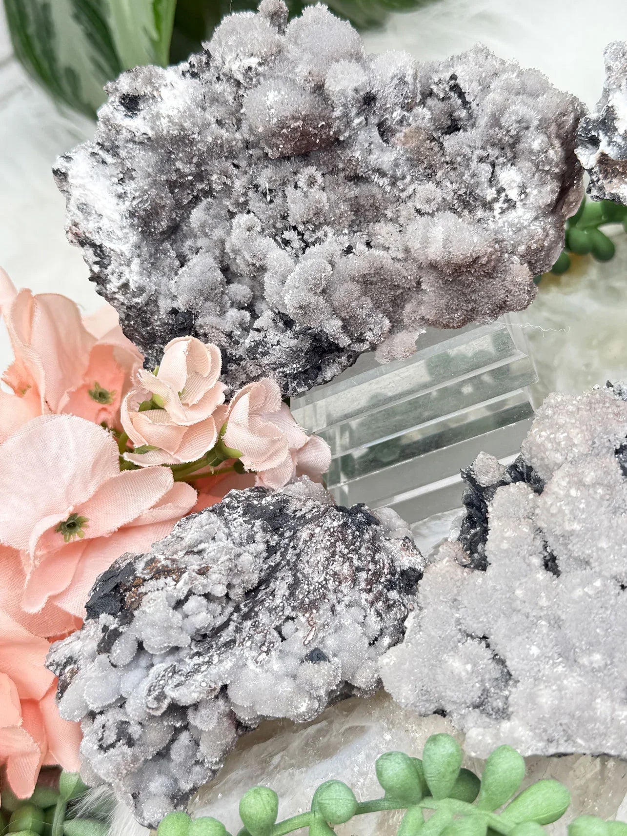 Stunning black and gray Willemite clusters from Mexico. Such a cool mix of formations, sparkles and growth patterns. Willemite is a somewhat rare crystal so you won't find these out there like quartz or amethyst. These are NOT UV reactive, just a heads up. Super cool still! Take a look at the video for a full 360 of each piece!