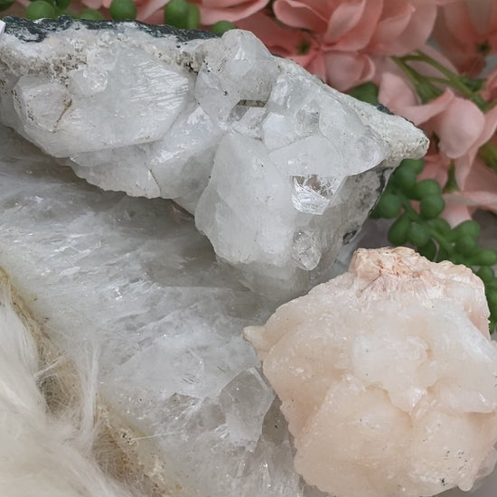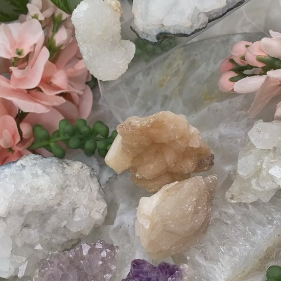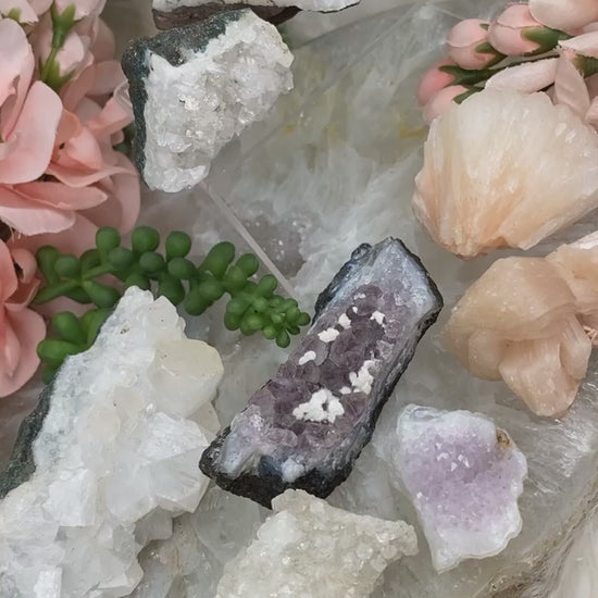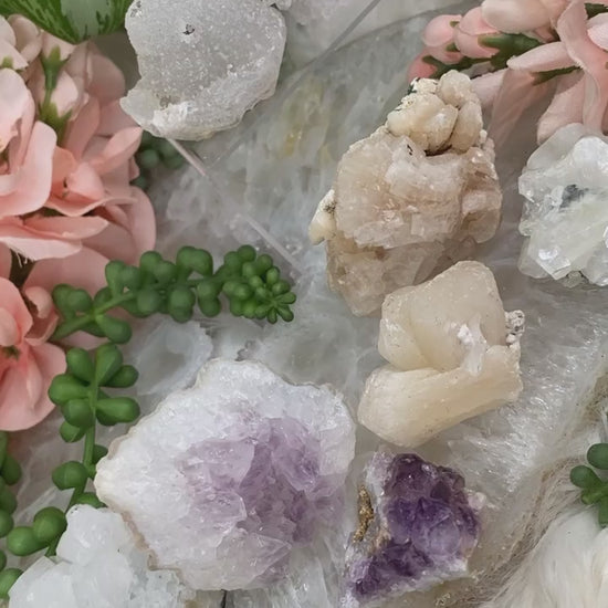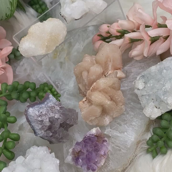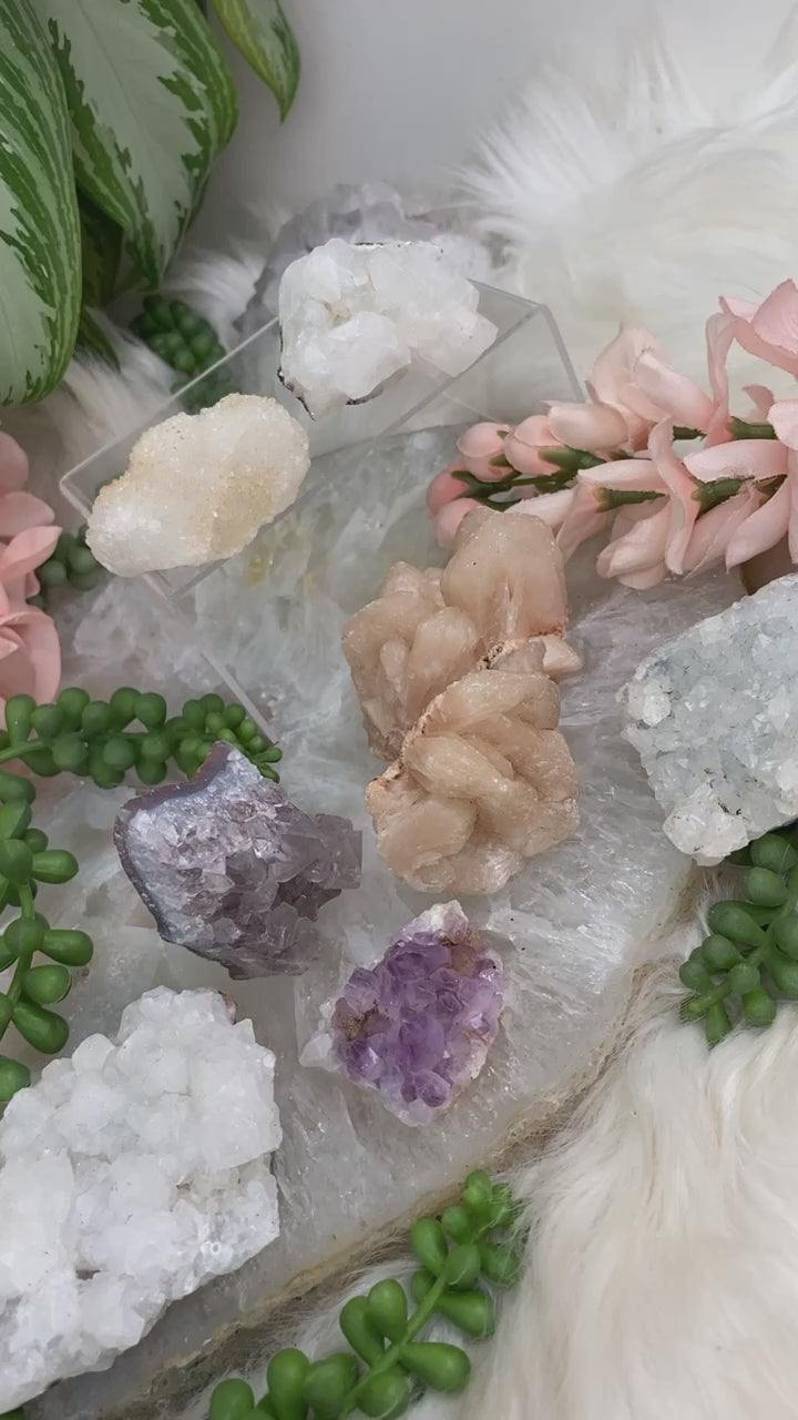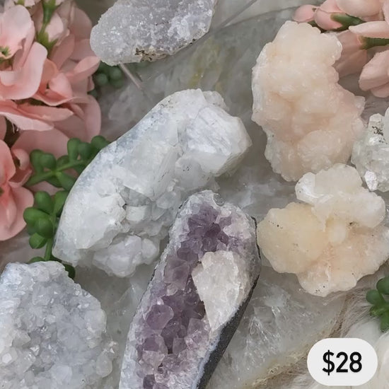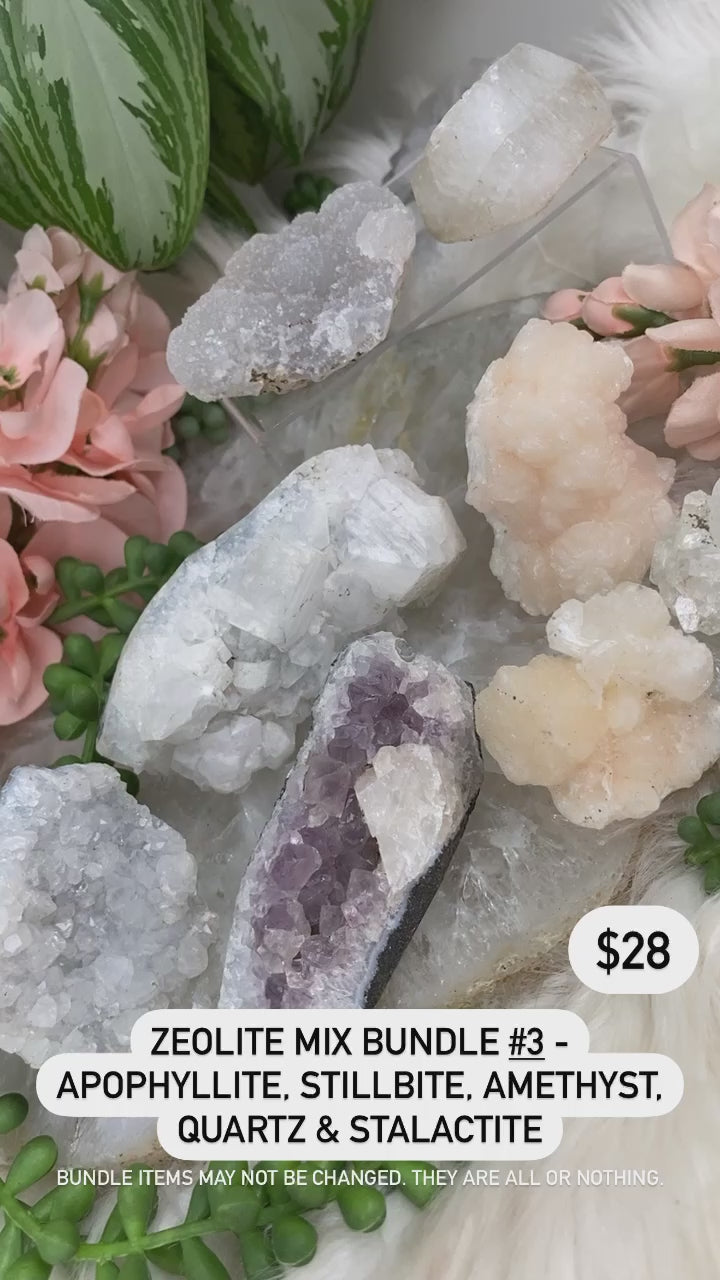 Adorable bundle sets of zeolite mixed specimens. Some of these are small two-piece sets, and some are larger sets! All specimens from India including apophyllite, stilbite, chalcedony, quartz, and amethyst. Each bundle is unique and includes exactly what is shown in the specific photo. You may not change out pieces, bundles are as is.